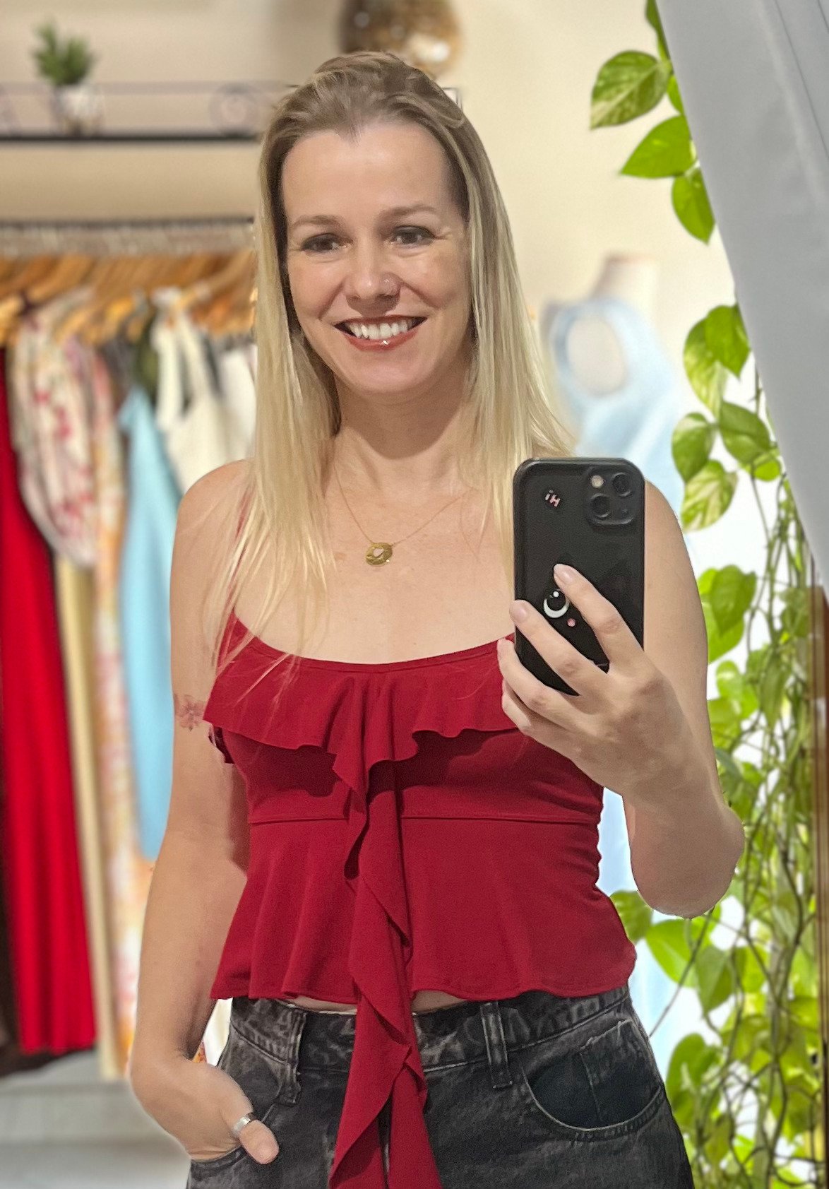 A Blusa Feminina com Babado  é aquela peça prática que transforma o look com um toque de charme. O decote com babado traz movimento e modernidade, enquanto a amarração frontal permite ajuste sutil que valoriza o caimento.