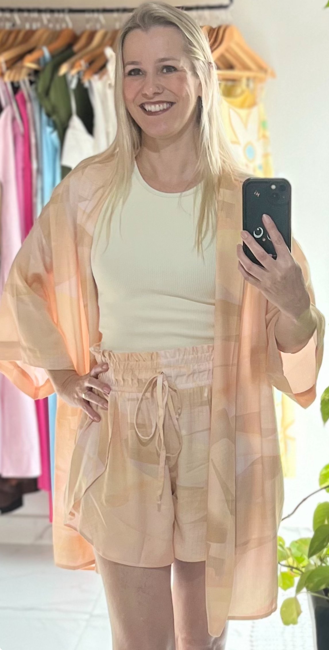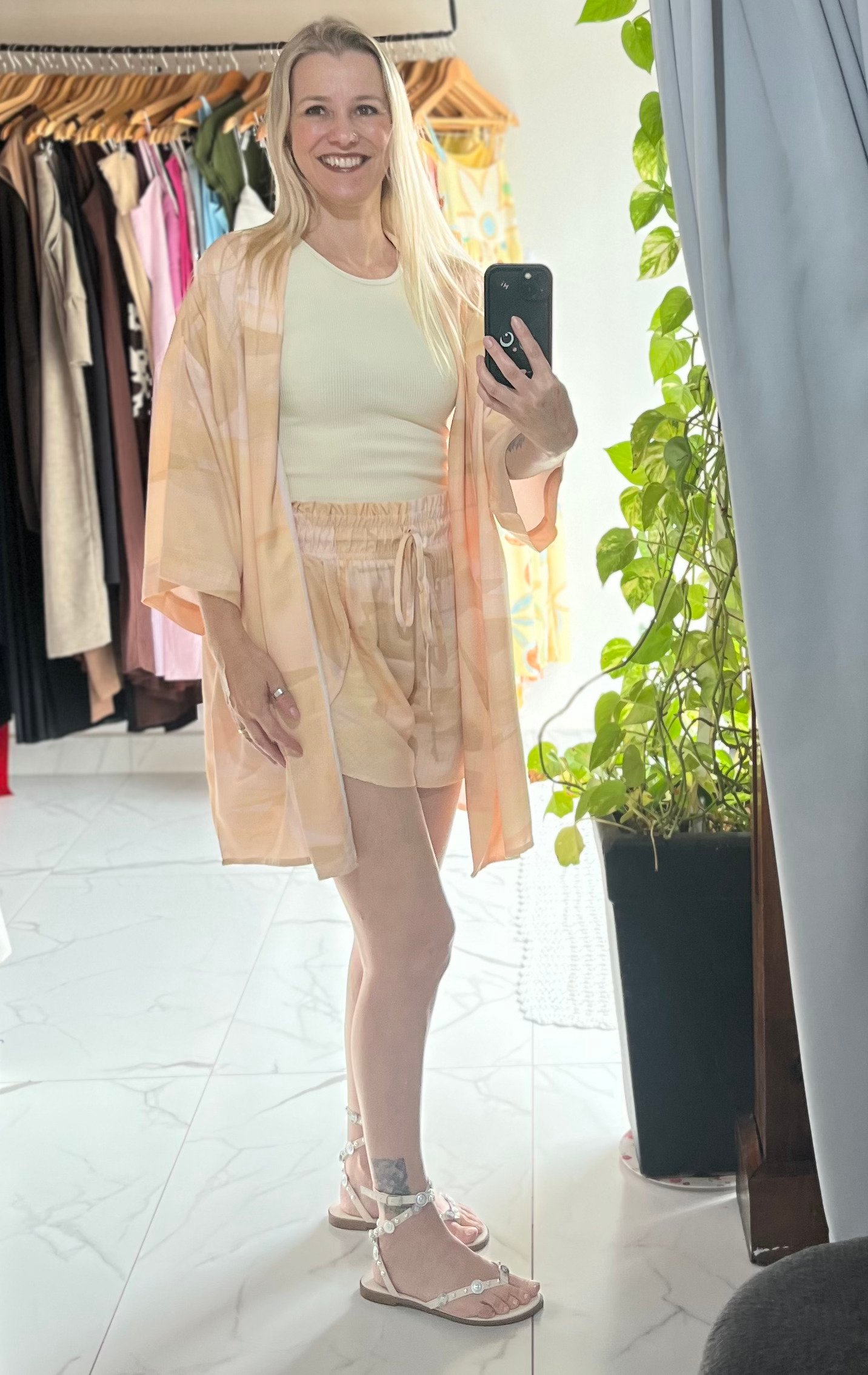 O kimono de modelagem soltinha, com mangas amplas, traz fluidez e movimento, enquanto o short de cintura alta com elástico e amarração garante ajuste confortável ao corpo. A estampa suave em tons de pêssego cria um visual moderno e fácil de combinar, perfeito para composições leves e atuais.