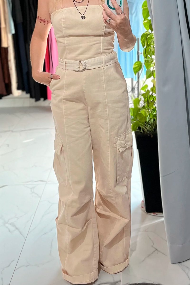 O macacão bege cargo é a peça perfeita para unir conforto e estilo em uma produção moderna. Com modelagem reta, bolsos utilitários e cinto no mesmo tecido, ele traz praticidade e um toque fashion para qualquer ocasião.