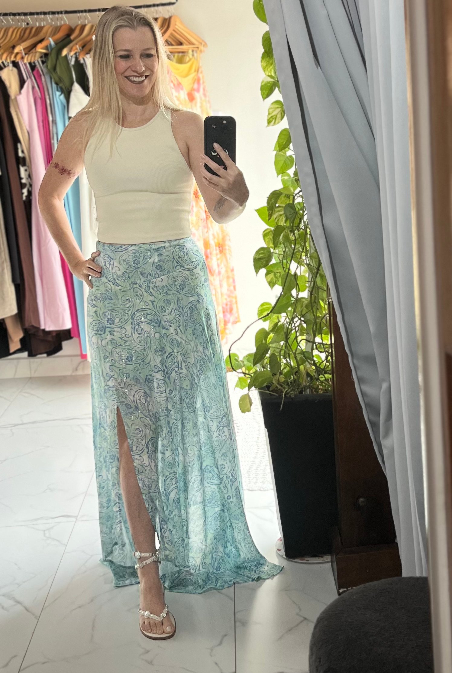 A estampa delicada em tons de azul traz um visual sofisticado e atemporal, enquanto a fenda frontal adiciona charme e feminilidade na medida certa, valorizando a silhueta e garantindo liberdade ao caminhar.