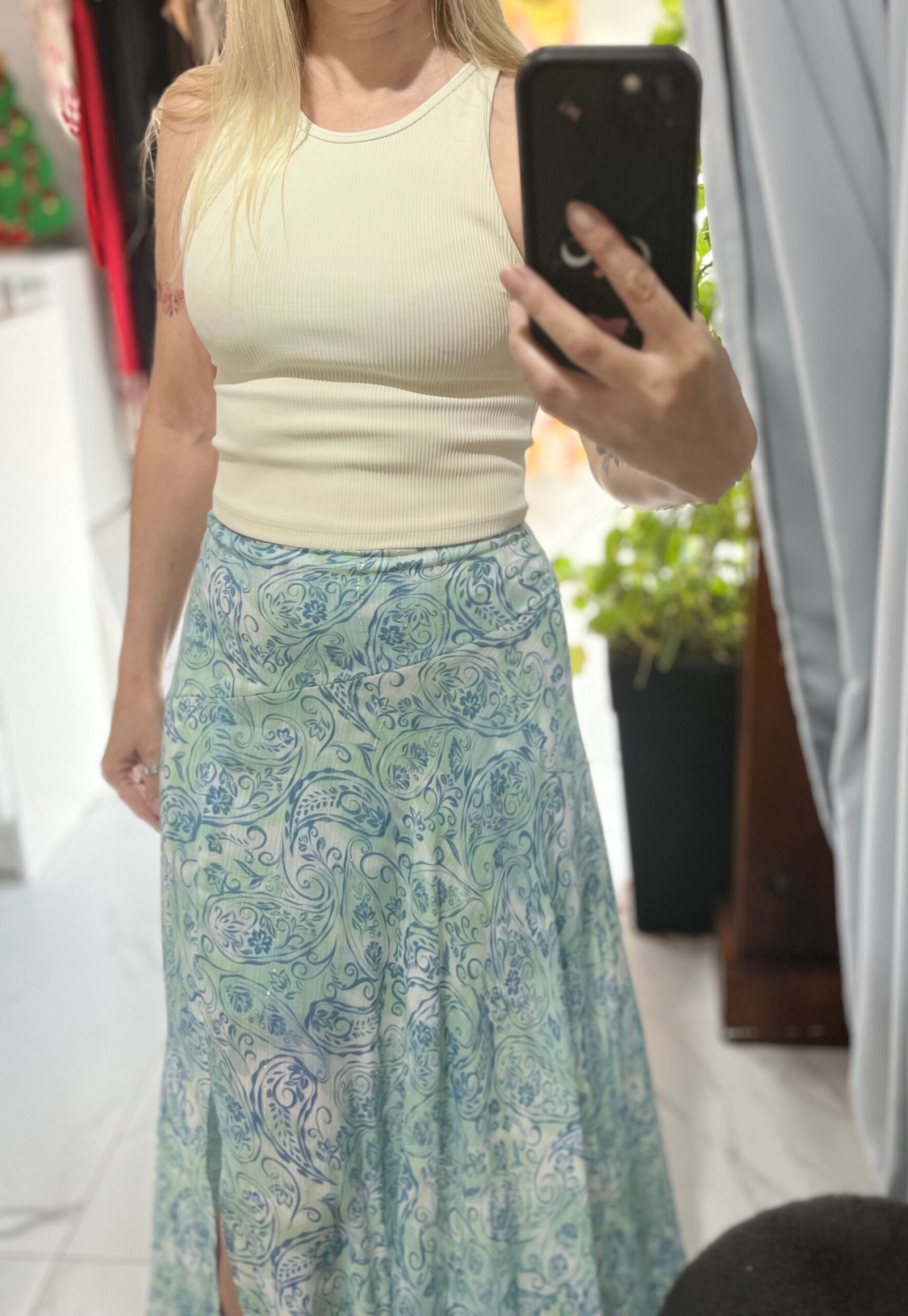 A Saia Longa Estampada azul é a escolha ideal para quem busca leveza, elegância e movimento. Confeccionada em tecido fluido e fresco, ela proporciona conforto absoluto e um caimento impecável, perfeito para os dias mais quentes.