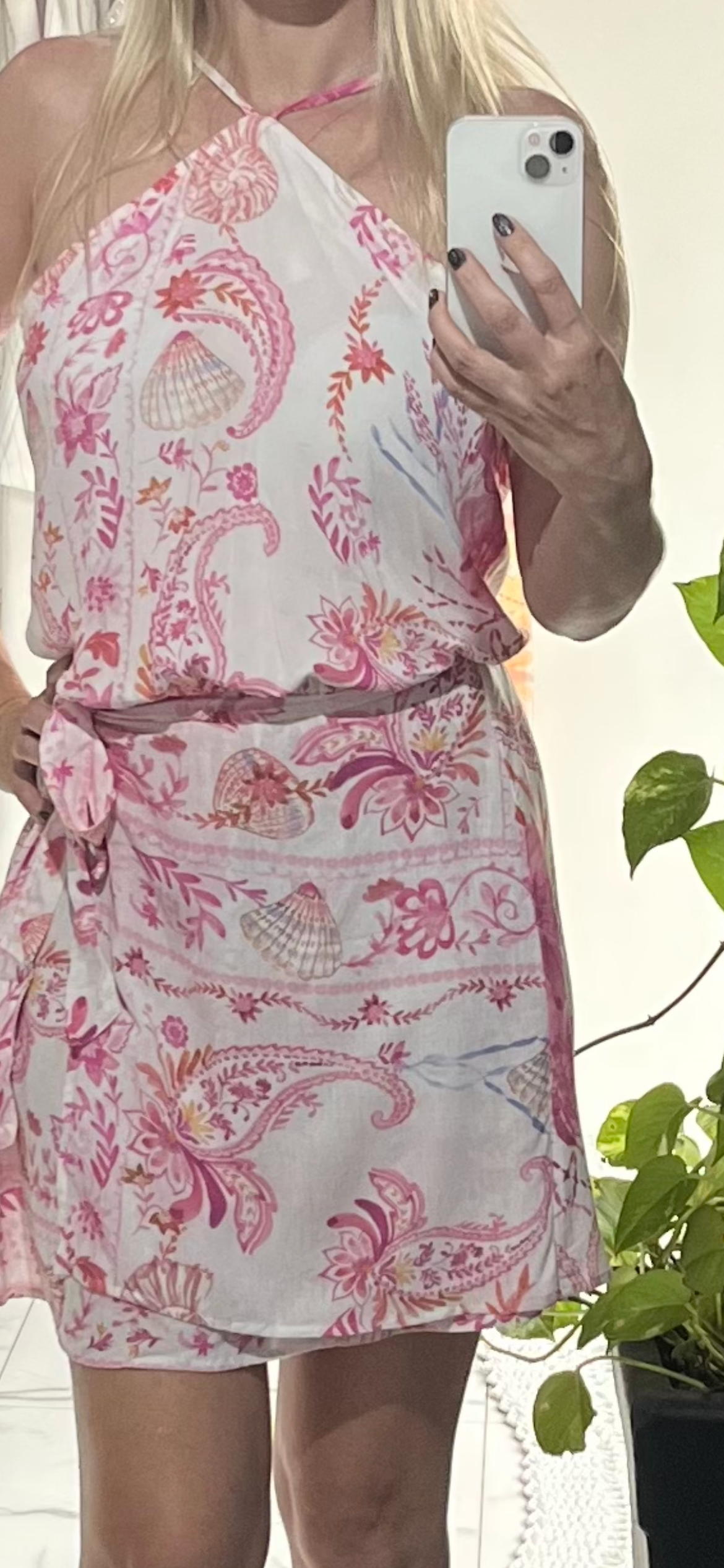 A estampa em tons de rosa sobre o fundo branco traz um toque leve e feminino, enquanto o tecido fluido oferece movimento e conforto. A amarração na cintura permite ajuste perfeito, destacando o corpo com suavidade.