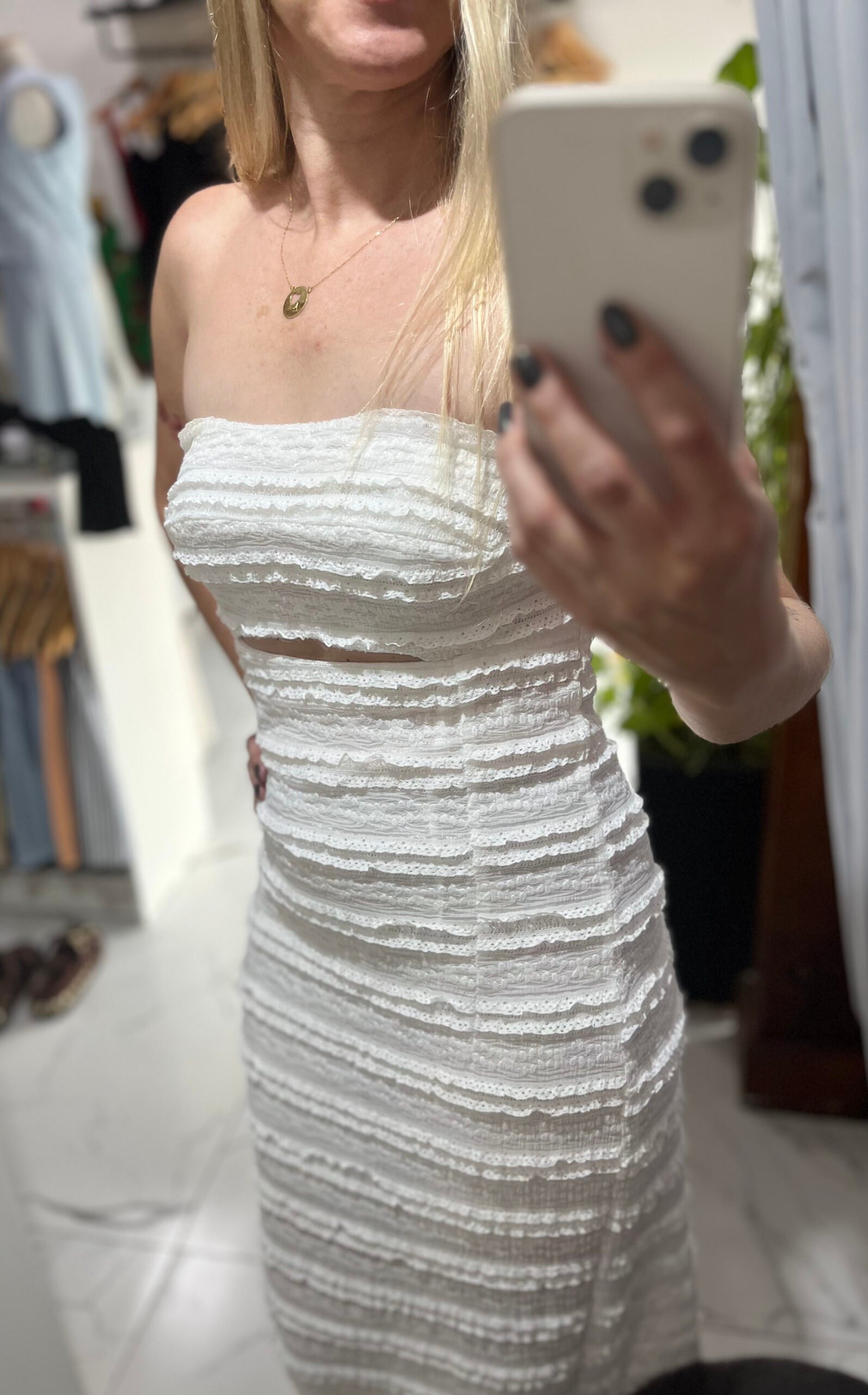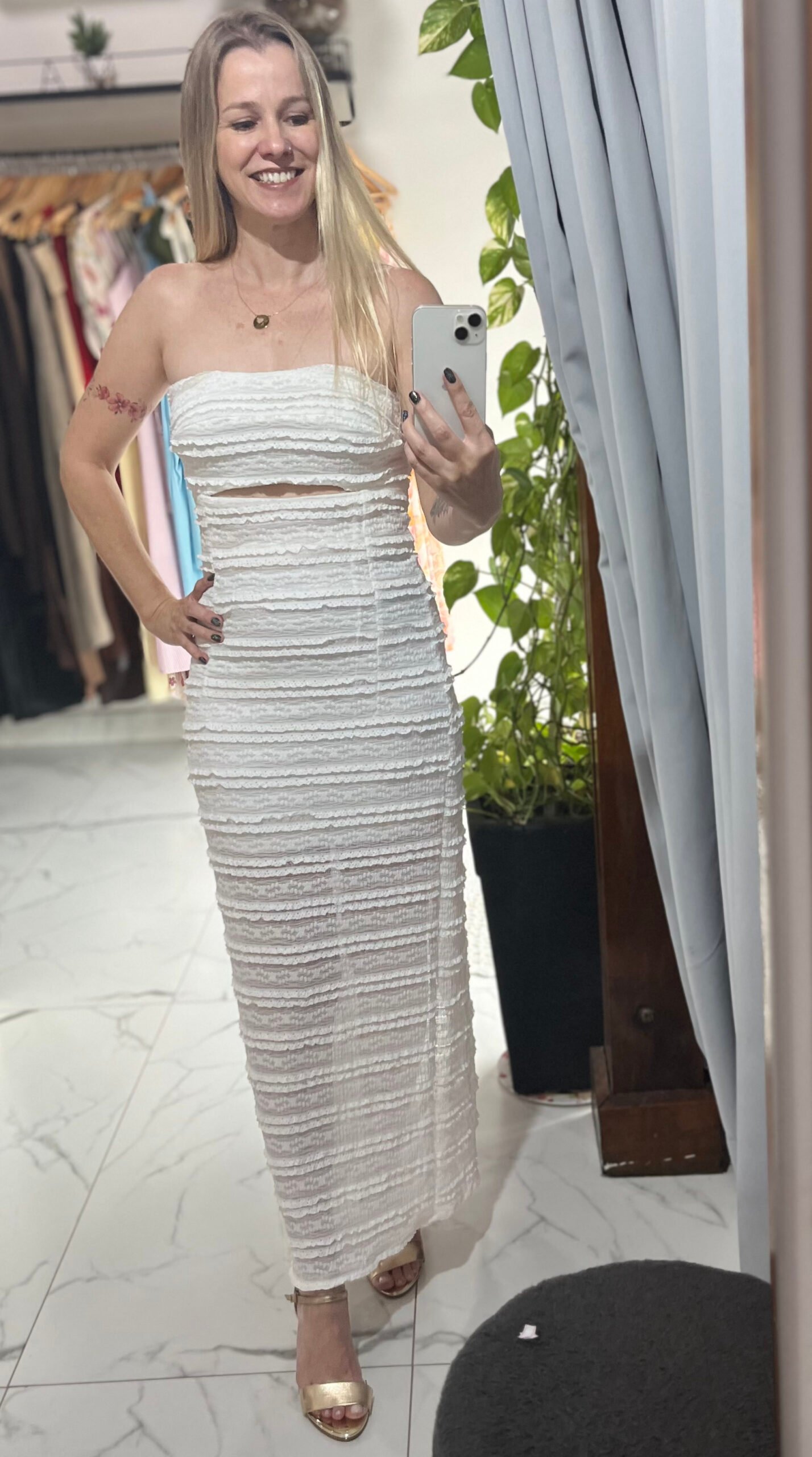 O vestido longo tomara que caia texturizado é a escolha perfeita para quem busca elegância com um toque contemporâneo. Seu tecido texturizado, com camadas discretas e efeito tridimensional, cria um visual sofisticado e único.